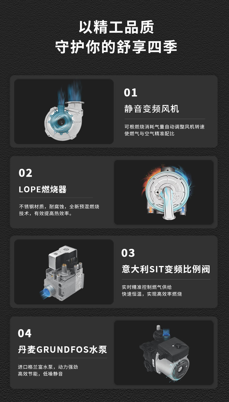 核心部件均源自歐州,性能更穩(wěn)定,抗垢能力強(qiáng),適用各種水質(zhì),使用壽命長多重智能變頻調(diào)節(jié),高效恒溫,讓體感更舒適,7天24小時定時編程功能,可隨意設(shè)計(jì)工作時段及溫度,滿足節(jié)能及個性化需求。