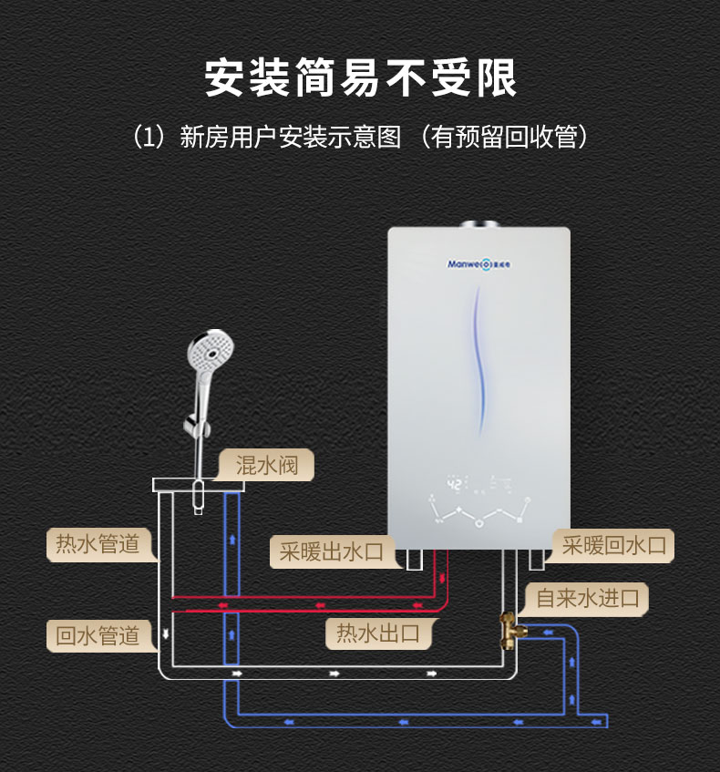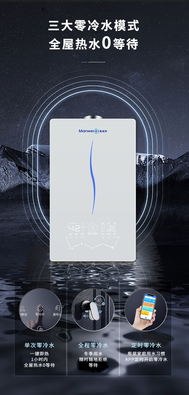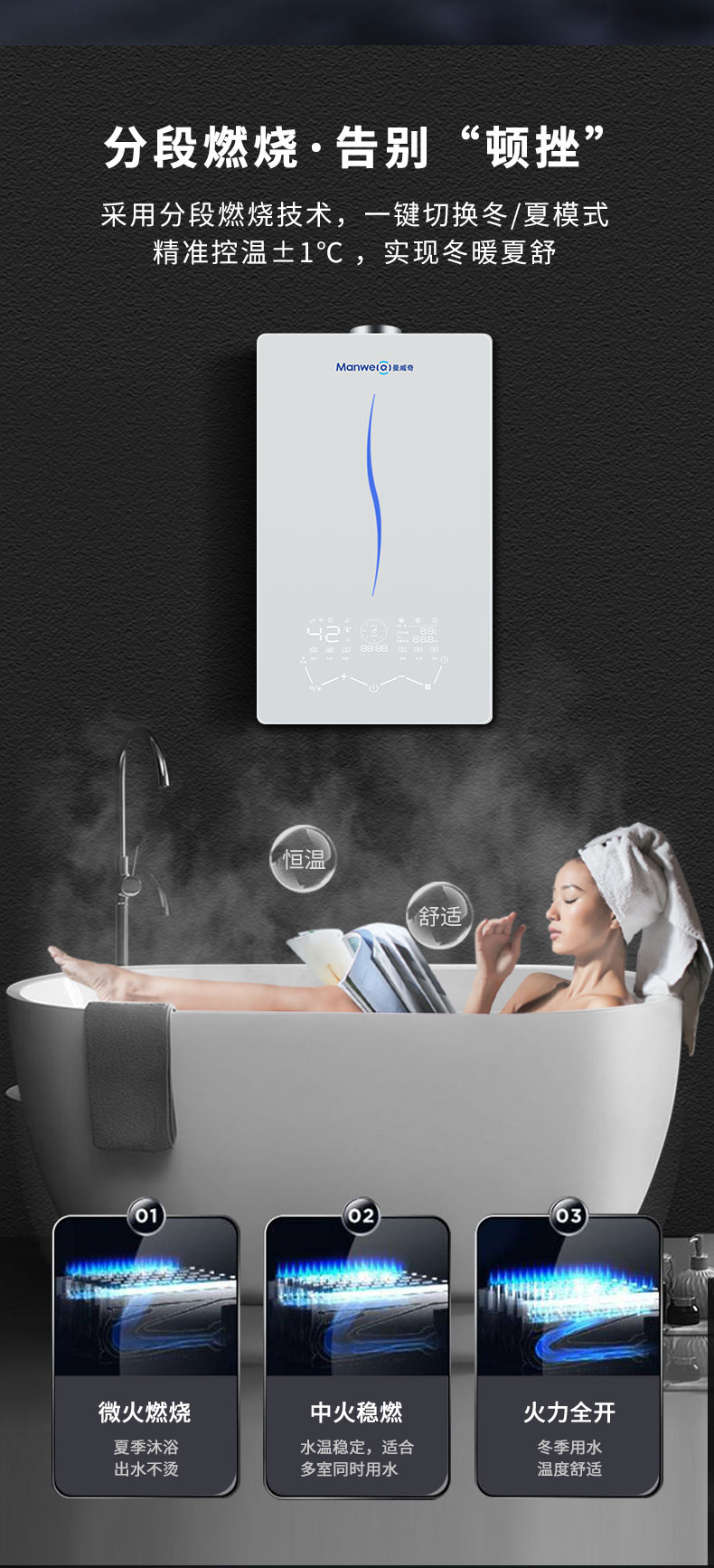 零冷水,分段燃燒技術感覺更寬頻即熱式沐浴體驗,水溫水壓穩定具有氣候補償功能,舒適節能。全銅質板換器采用蜂窩式分層設計,熱水交又對流,加熱更快更恒溫,體驗更舒適。21重安全保護功能全方位監控運行狀況,安全無憂。
